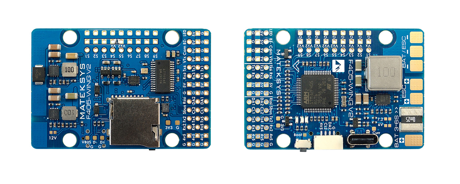 The Matek F405-Wing-V2 is a dedicated fixed-wing and VTOL flight controller built around the STM32F405 processor. Designed for ArduPlane and INAV firmware, it features 10 PWM outputs for servo and motor control, a built-in current sensor rated at 100A continuous and 220A peak, and three onboard BECs for powering FC, servos, and VTX independently. The V2 revision brings USB Type-C, an upgraded ICM42688-P IMU, DPS310 barometer, and increased current sensing capacity over the original F405-Wing. A popular choice for fixed-wing FPV builds, gliders, and VTOL aircraft requiring reliable long-range navigation support.